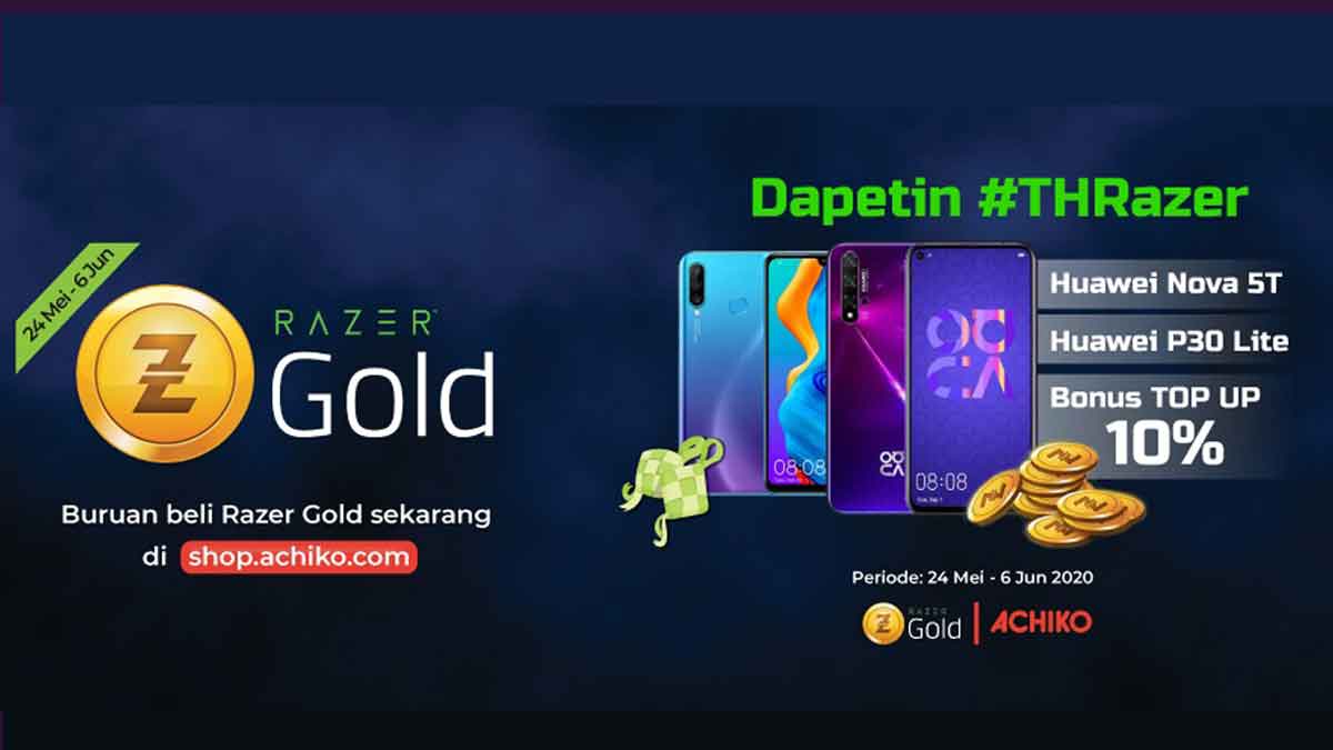 Biar kamu ga bosen #DiRumahAja, Ada #BerkahLebaran berupa Bonus #THRazer 10% dan juga 2 buah Smartphone huawei terbaru yang bisa kamu dapatkan dari Achiko dan juga Razer Gold.
